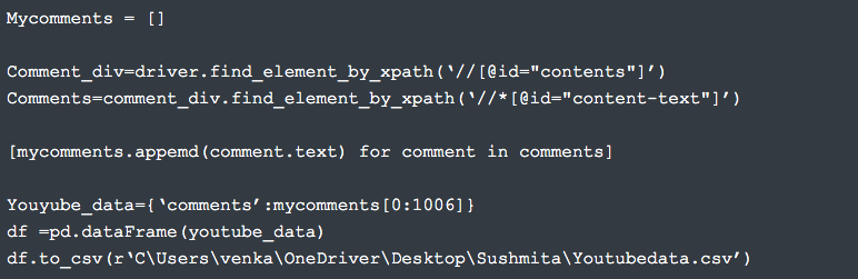 After scraping the relevant data from the web pages are done. We have to store the data in a structured format. For example, here we are storing the comments data into a .csv file using Pandas module.