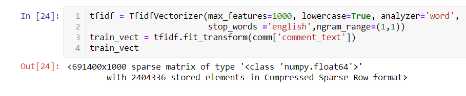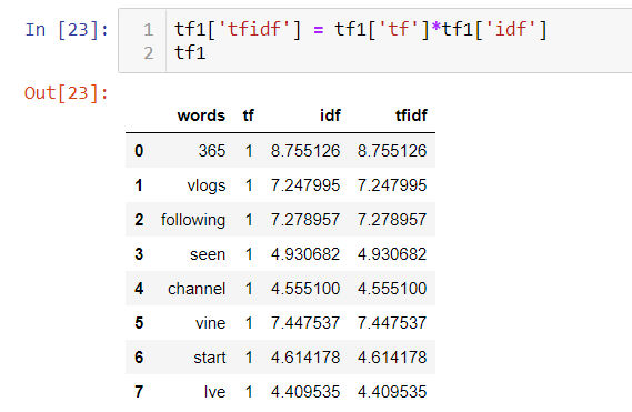 We don’t have to calculate TF and IDF every time beforehand and then multiply it to obtain TF-IDF. so, sklearn has a separate function to directly obtain it use of : from sklearn.feature_extraction.text import TfidfVectorizer (library)