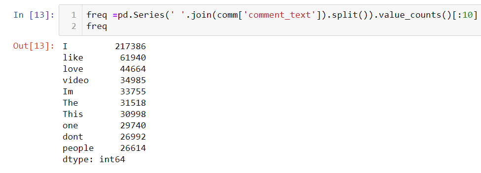 We can also remove commonly occurring words from our text data First, here, check the 10 most frequently occurring words in our text data then take call to remove.Now, remove those words as their presence will not of any use in classification of our text data.