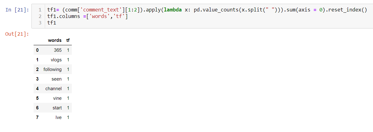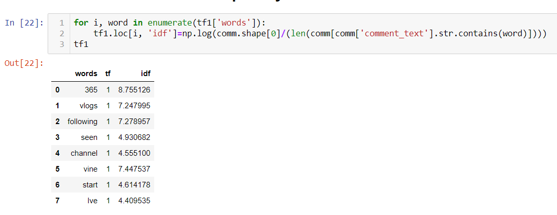 where, N is the total number of rows and n is the number of rows in which the word was present.